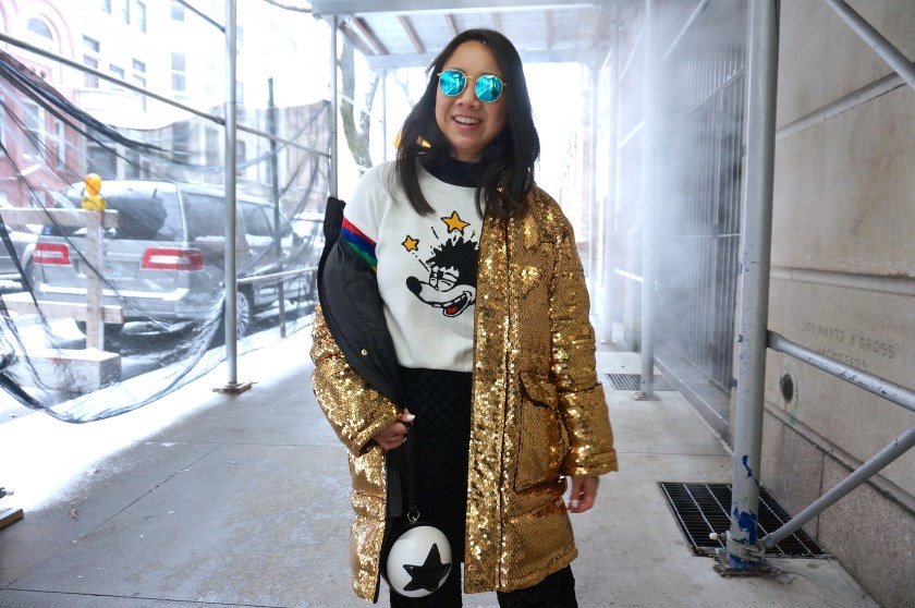So let’s jump right in and break down this outfit.ย And we’ll start with the most obvious piece — this crazy H&MxMoschino gold sequin parka!ย I’ve been meaning to break out this bad boy for the perfect occasion.ย So when I was packing for New York, I knew it would be the item that I built my outfit around.ย PLUS, it’s a padded parka that was perfect for the cold weather.